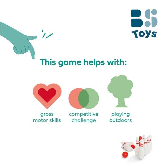 Het BS Toys bowling spel bestaat uit 10 houten kegels met een hoogte van 18 cm en twee houten ballen. De kegels zijn afgewerkt met verf in de kleuren wit en rood. Het bowlingspel is geschikt voor kinderen vanaf 4 jaar en is ook leuk voor volwassenen.
