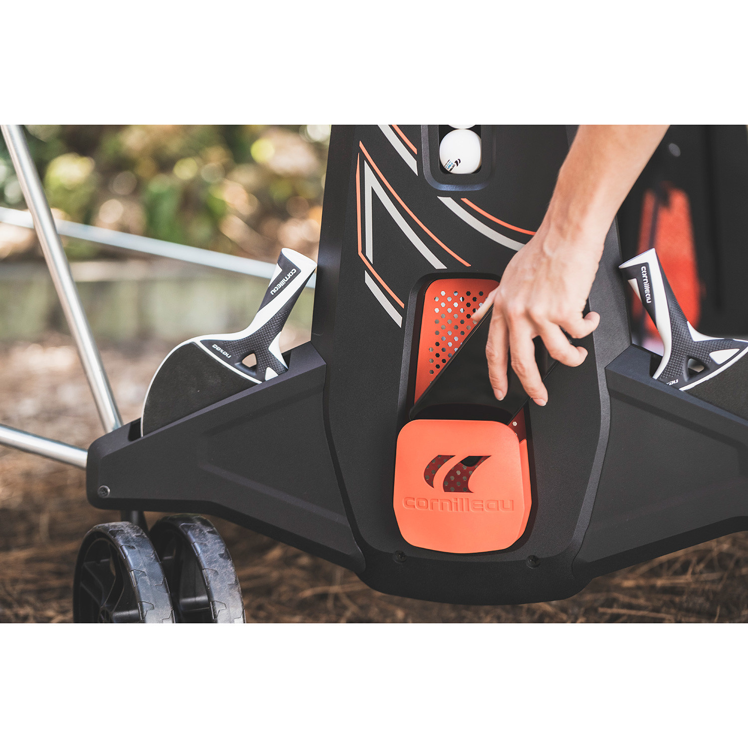 Naast een prachtig design met oranje accenten biedt de Cornilleau 600X outdoor tafeltennistafel je een geweldige speelervaring. Met zijn 7 mm dikke speeloppervlak van harslaminaat heeft de 600X tafeltennistafel een uitstekende rebound en perfecte spin respons, vergelijkbaar met de speelkwaliteit van tafeltennistafels bij een tafeltennisclub. De 600X outdoor tafeltennistafel is van alle gemakken voorzien met bal-en bathouders, accessoire houders, bekerhouders, baldispensers en puntentellers. Ook is de 600X tafeltennistafel voorzien van beschermhoeken om blessures tegen te gaan. Met een hoogte van 60 mm heeft de 600X tafel een indrukwekkend frame dat het speelveld een onberispelijke houvast biedt. Alle metalen die in de Cornilleau 600X outdoor tafeltennistafel gebruikt zijn hebben een anti-corrosie coating en het speelveld is schok-en weerbestendig. Dankzij het Compact Technology vouwsysteem, het geavanceerde vergrendelingsysteem en het automatisch in hoogte en spanning verstelbare net is de Cornilleau 600X zeer gebruikersvriendelijk, veilig en stabiel. Met de extra grote, goed wendbare wielen en de handgreep verplaats je de tafeltennistafel makkelijk over ruw terrein en obstakels. Met het innovatieve leveling systeem en de brede voet is de Cornilleau 600X outdoor tafeltennistafel goed recht te plaatsen op ongelijke grond en met de twee remmen blijft de tafeltennistafel op zijn plek staan terwijl je speelt en ook als de tafel opgeborgen is.
