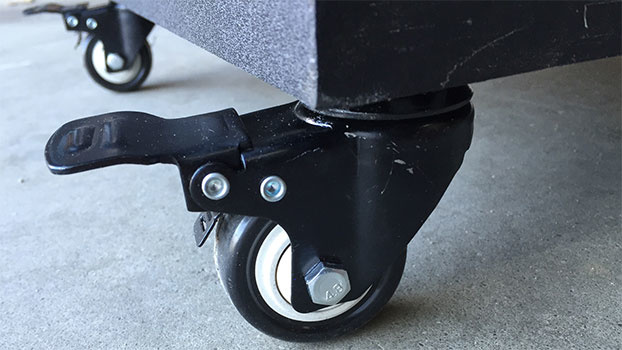 Compleet uniek is dat deze is geplaatst op een stevige stand met 4 zwenkwielen voorzien van rem, daardoor eenvoudig in de opbergstand aan de kant te rollen of in de juiste positie te plaatsen om neer te klappen.
