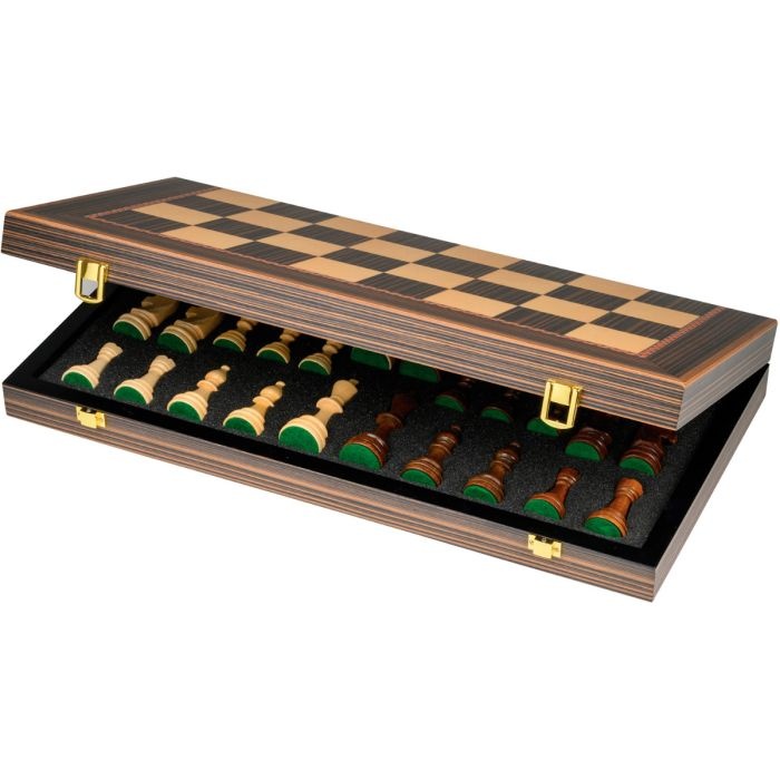 De cassette is gemaakt van MDF en ingelegd met ahornfineer en fineerpapier. Deze schaakset in toernooi formaat heeft een veldmaat van 55 mm.