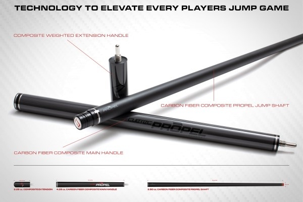 Featuring an all-composite construction and weighing in at an ultralight 11 ounces with its weighted extension attached, Propel jump cues not only excel at both full-table and close proximity jumps, but provide tremendous accuracy and eliminate unintended side spin thanks to their oversize 13.9mm tip diameter. Packed with Carbon Fiber technology in not only the shaft, but also the main handle, Propel jump cues transfer more energy than any other jump cue we have ever tested. Safe, just isn’t quite as safe when you have a Propel in your arsenal.