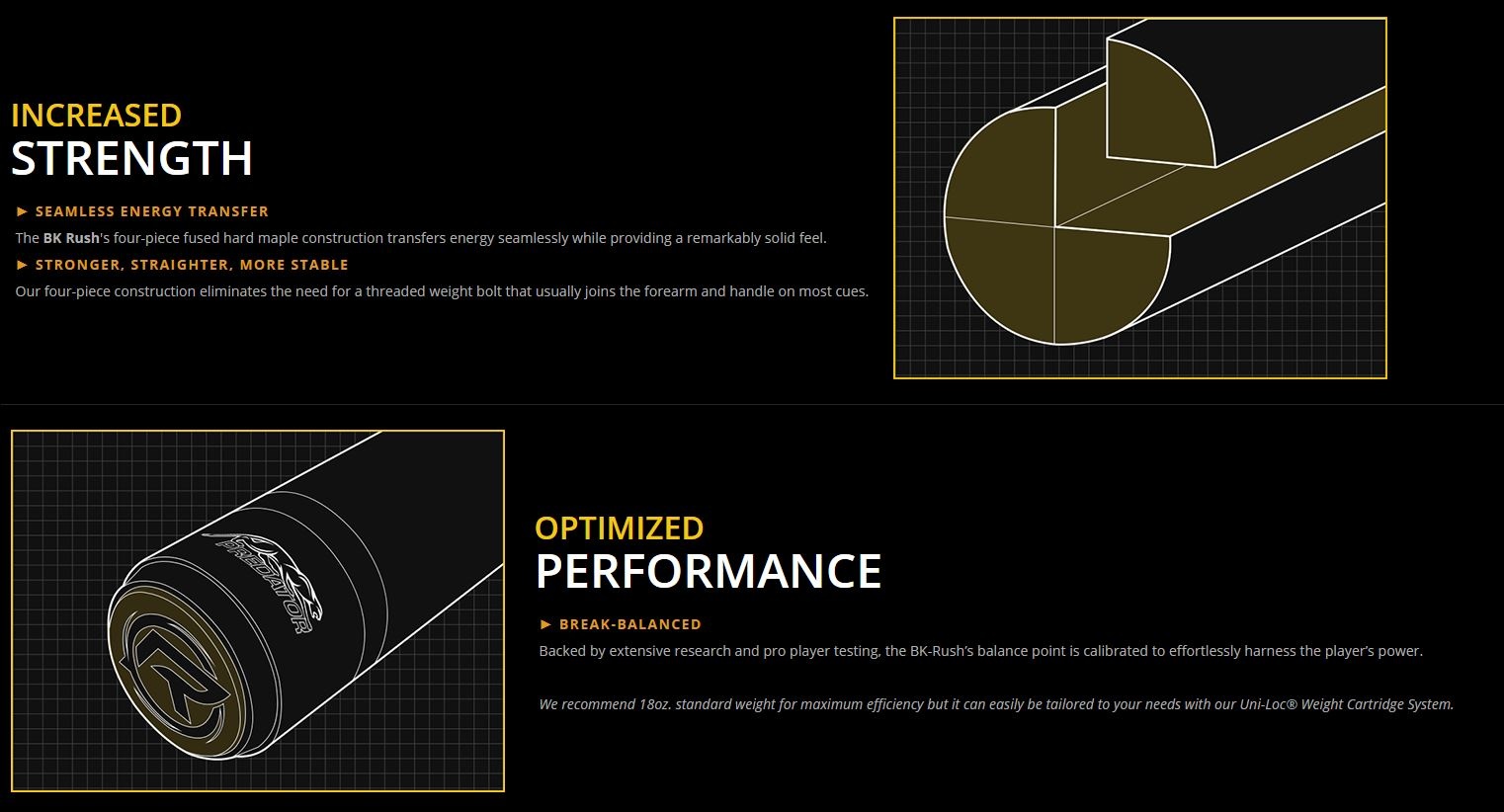 The BK Rush sets the standard for break performance — now supercharged in royal purple. Engineered for explosive power, its four-piece construction and carbon fiber REVO shaft deliver unmatched force and precision. The purple finish commands attention, reflecting the relentless energy of every break.