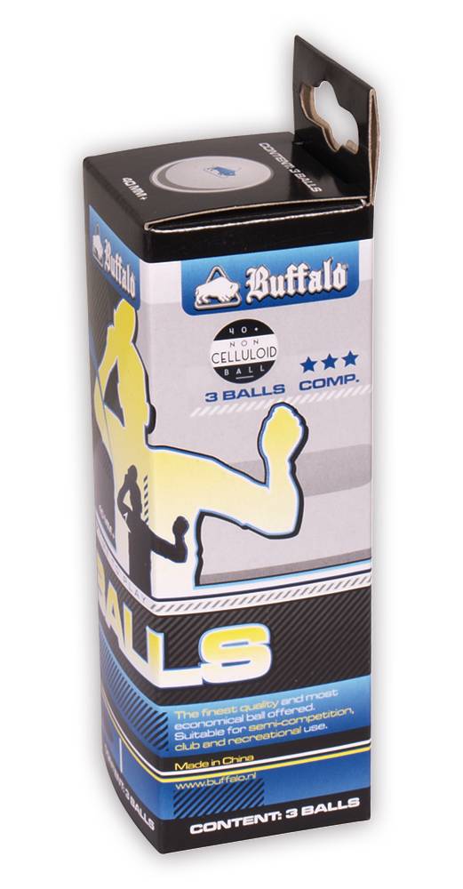 De Buffalo tafeltennisballen Competitie is een set van 3 balletjes van plastic, geheel celluloid vrij.