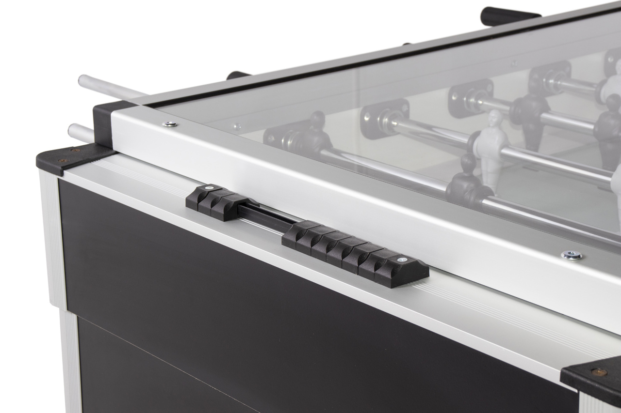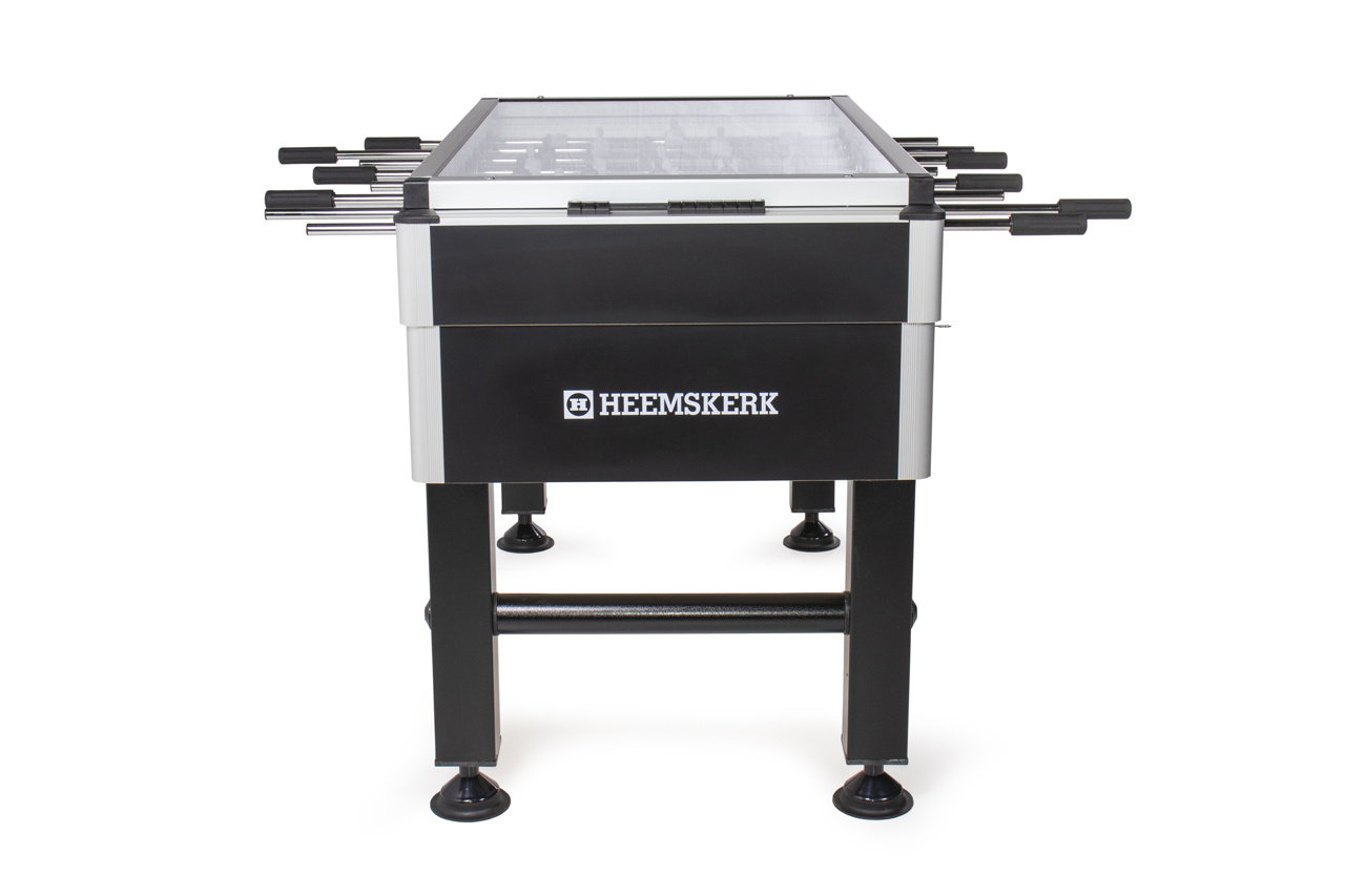 De voetbaltafel Tactic is met recht de trots van het Heemskerk tafelvoetbal assortiment. Dat komt niet alleen door de stoere en strakke uitstraling van de tafel, maar vooral doordat deze voetbaltafel enorm stevig is. Je speelt namelijk op een tafel die is opgebouwd uit een MDF speelbak met zijpanelen van 25 mm dik en een metalen onderstel (90×90 mm) voorzien van rubberen stelvoeten. Verder heeft de Tactic voetbaltafel extra dikke stangen van maar liefst Ø 18 mm. De massief stalen stangen bevatten veel carbon en zijn behandeld om roest tegen te gaan. Dat maakt ze tot wel 20% sterker dan andere voetbalstangen. Bovendien zijn de poppetjes op de stangen gegoten in plaats van geschroefd, waardoor ze nagenoeg onbreekbaar zijn. Ideaal dus voor een intensief tafelvoetbal duel tussen klasgenoten, vrienden of collega’s.